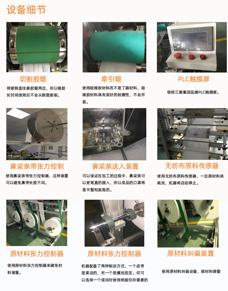 4、全自动外耳带电焊机同时制作口罩片材和外部耳焊点部分,可节省劳动,一旦无纺布原材料在使用的过程中使用完,机器会自动停止。