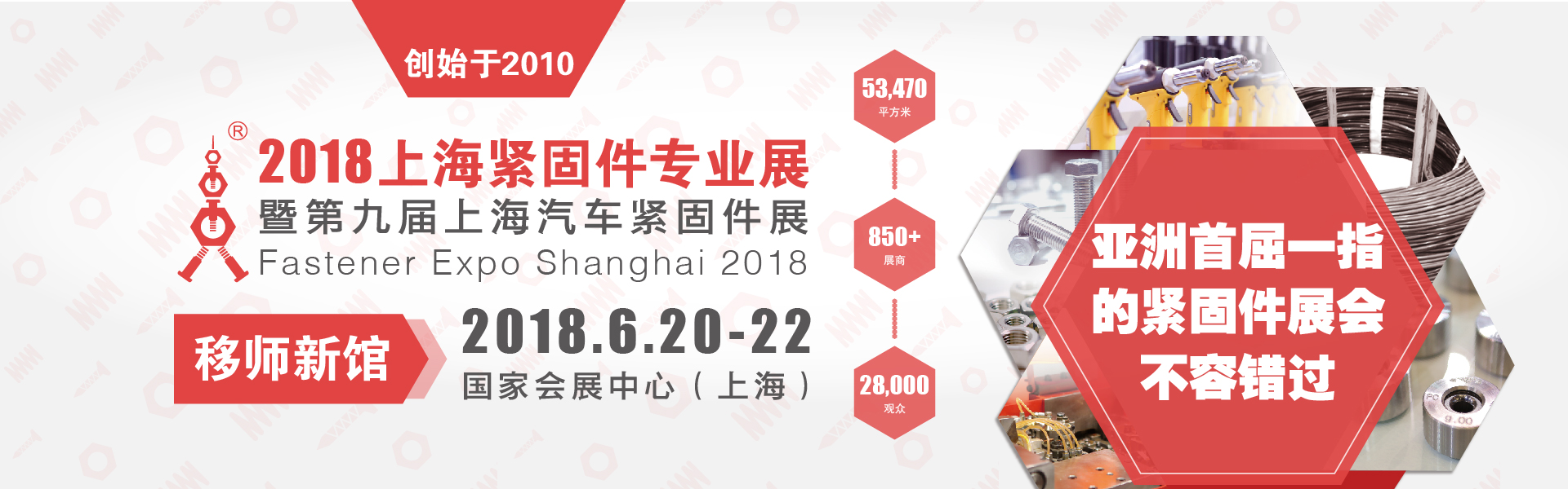 由ITE集团分公司——艾特怡(亚洲)展览有限公司及上海上搜展览有限公司联合主办的「2018上海紧固件专 业展暨第九上海汽车紧固件展」将于2018年6月20日至22日在上海国家会展中心召开,活动以“先进制造”、“高新材料”、“紧扣终端”为主线引领紧固件行业继续腾飞。