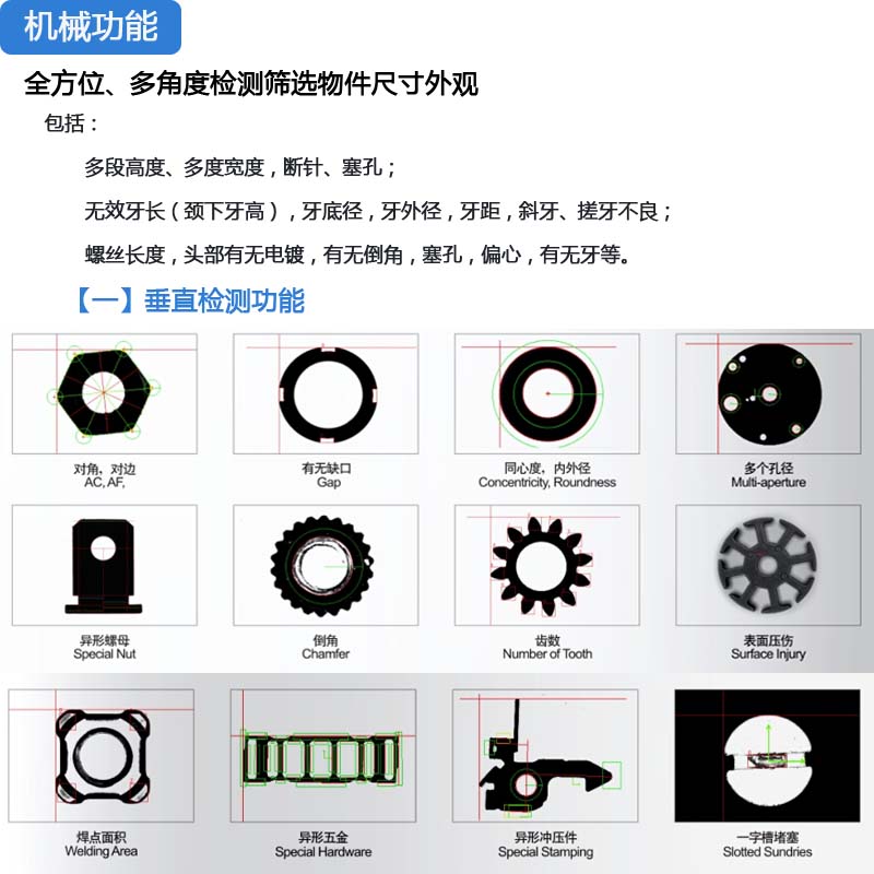 硬体配备包含振动送料机、下料轨道、检验平台、计算机系统為一安全、便利,且节省人力成本的自动化设备。分别介绍如下:
