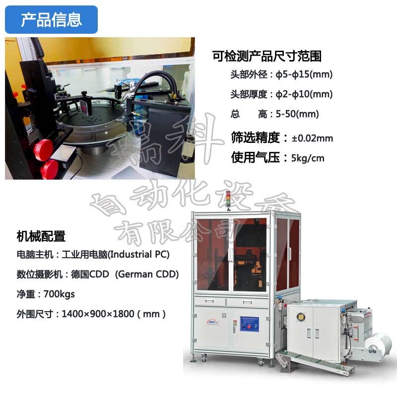 硬体配备包含振动送料机、下料轨道、检验平台、计算机系统為一安全、便利,且节省人力成本的自动化设备。分别介绍如下: