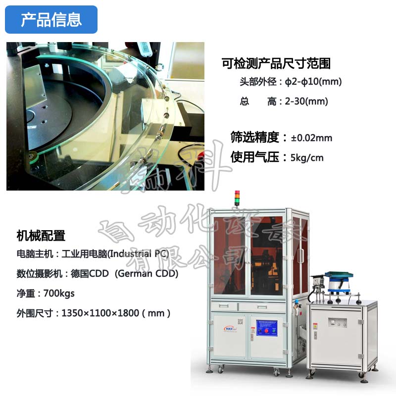 硬体配备包含振动送料机、下料轨道、检验平台、计算机系统為一安全、便利,且节省人力成本的自动化设备。分别介绍如下: