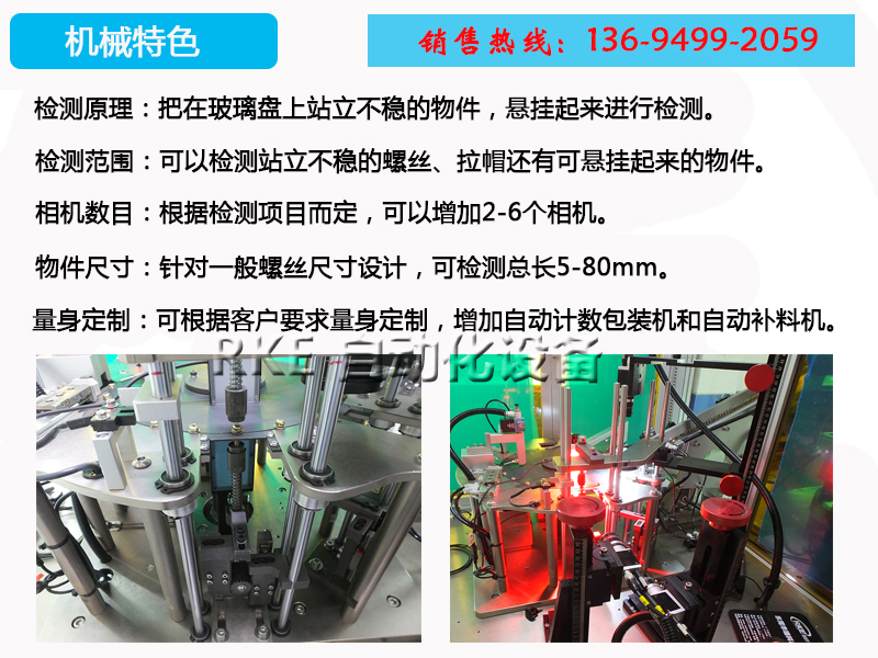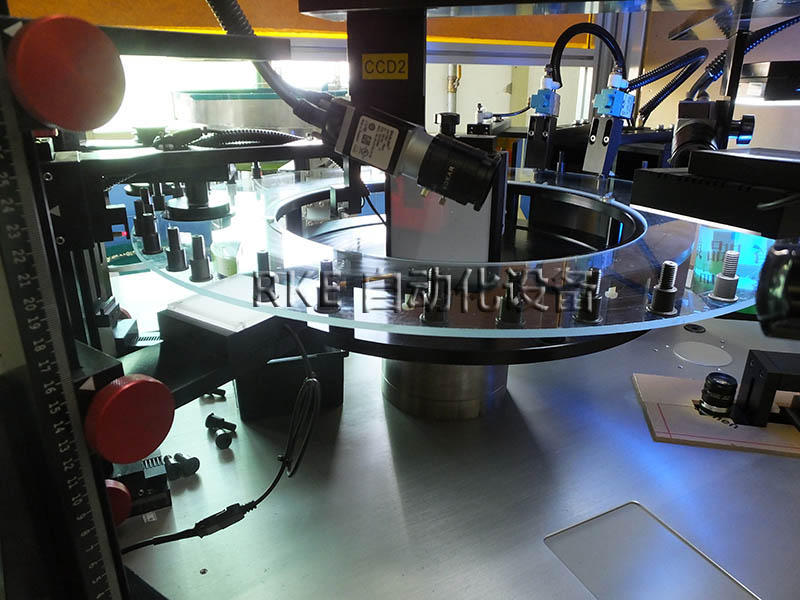 分度盘筛选设备检测螺丝,把在玻璃盘上站立不稳的物件,悬挂起来进行检测。检测范围广,速度快,精度高